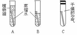 十天后,发现B中铁丝慢慢生锈,且水面处铁丝生锈较严重,而A、C中铁丝基本无变化。