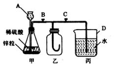 (3)实验时先检验氢气的纯度,然后关闭开关C,打开开关B,点燃氢气并迅速插入乙装置中,直至火焰刚好熄灭时关闭B,冷却至室温后,下一步操作是 ,在乙中观察到的现象是 ,即达到实验目的。