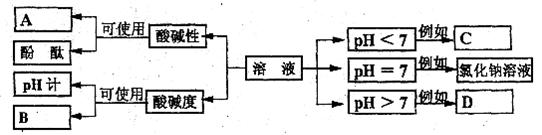 2.(4分)概念图对一些知识点进行整理,十分有用。请把①稀硝酸②石蕊试液③碳酸钠溶液④pH试纸的序号分别选填在下列有关溶液概念图中的A、B、C、D处(每个序号只能选填一次).