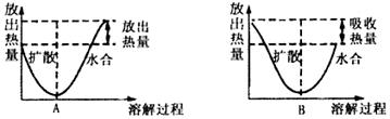 21.(6分)在溶解过程中发生了两种变化:一种是溶质的分子或离子向水中扩散,这种过程(放出、吸收) 热量,另一种是溶质的分子(或离子)和水分子作用,生成水合分子(或水合离子),这一过程 热量。硝酸铵溶于水的过程是 图示表示的过程。