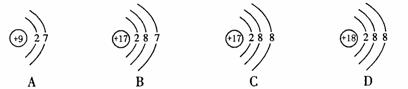 9、下列四种粒子的结构示意图中,属于稀有气体元素的原子是
