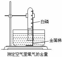 某同学为测定空气里氧气的含量,设计了如图所示的实验装置。该同学在“金属梯”的每一步的凹处放置一颗用滤纸吸干水后的白磷,用放大镜会聚6V手电筒光于靠近水面的一步“金属梯”处的白磷上。请回答18-19题。