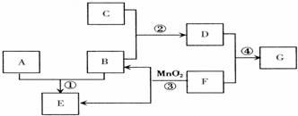 (2)写出反应③的化学方程式: ,反应中二氧化锰作 剂,这一反应体现了物质F的 性。