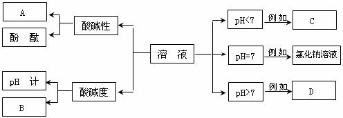22.(4分)概念图对一些知识点进行整理,十分有用。请把①稀硝酸②石蕊试液③碳酸钠溶液④pH试纸的序号分别选填在下列有关溶液概念图中的A、B、C、D处(每个序号只能选填一次):