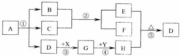24.(5分) A是绿色粉末,G是蓝色溶液,X为常见的稀酸,B、C、D、E、F、H和Y中初中化学常见的物质。它们之间转化关系如下图所示,反应①、②、③、④和⑤是初中化学常见的反应。