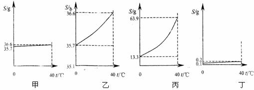 26.(5分)以下图示中的甲、乙两图分别表示氯化钠在水中的溶解度曲线,丙图表示硝酸钾在水中的溶解度曲线,丁图表示氯化钠在某有溶剂中的溶解度曲线。