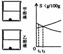 C.降低温度到t2℃,甲中的固体减少,乙中固体增加,