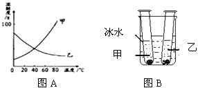 38. 甲、乙两种固体纯净物的溶解度曲线如图A所示。在常温下,先在两支试管里分别装入甲、乙两种物质的饱和溶液(试管底部均有未溶解的固体),再放进盛有冰水的烧杯里(图B)。下列说法正确的是