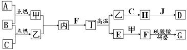 (3)J溶解于稀盐酸中,溶液呈黄色,反应完全后,再向溶液中加入纯净的D的粉末,溶液逐渐变成浅绿色,写出有关变化的化学方程式: 。