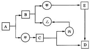 (1) 写出有关物质的化学式:A_________、乙_________、E_________;