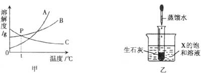 (2)如上图乙所示,将少量生石灰加入试管中,把试管放人常温下盛有X饱和溶液的烧杯中,再用胶头滴管向试管中滴人大约10mL蒸馏水,发现生石灰和水发生反应,同时烧杯中的容液出现浑浊,则X应该是A、B、C三种固体物质中的__________。
