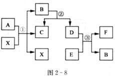 27.已知A、B、C、D、E、F为常见物质,其中A、B含有相同的元素,B、E为氧化物,C、D、F都为单质。它们之间相互转化的关系如图2-8所示(图中反应条件略去)。