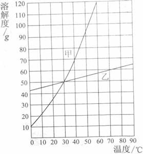 ⑵在______℃时,甲、乙两种物质的溶解度相等;70℃时,乙物质的溶解度为_____g。