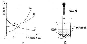 (3)如乙图所示,20℃时,把试管放入盛有X的饱和溶液的烧杯中,在试管中加入几小段镁条,再加入5mL稀盐酸,立即产生大量的气泡,同时烧杯中出现浑浊,则X可能为A,B,C三种同体物质中的哪一种? ___________。