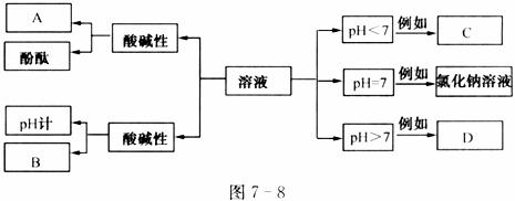 22.概念图对一些知识点进行整理,十分有用。请把①稀硝酸②石蕊试液③碳酸钠溶液④pH试纸的序号分别选填在下列有关溶液概念图7-8中的A、B、C、D处(每个序号只能选填一次):