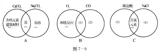 23.图7-9A中的两个圆分别表示CaCO3和Na2CO3的有关信息,两圆重叠的区域表示它们 的共同特征(相似点),重叠区域以外的部分表示它们的独有特征(不同点)。请你在图下横线上填写与图B、C中的(1)、(2)、(3)、(4)处相适应的内容(每处只要求填一点)。