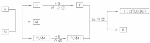 2l、(9分)A、B、C、D、E、F、H、I、M为初中化学常见的物质,且有下图所示的转化关系。已知A、B含有相同的元素,B、D、H、M为氧化物,C、E为单质,反应②是实验室检验气体H的反应。请回答: