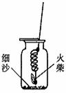 26.腾腾同学做细铁丝在氧气中的燃烧实验时,他把细铁丝绕成螺旋状,一端系在一根铁丝上,另一端系上一根火柴。点燃火柴后迅速把铁丝连同火柴一起插入集气瓶下部(没有接触到细沙如图所示),但不见铁丝燃烧,反复实验均未成功。