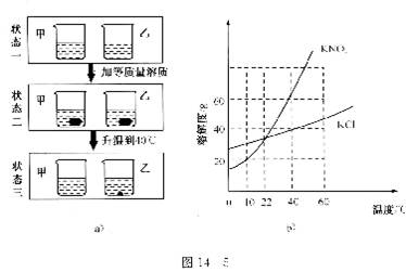 24.10℃时,在两个烧杯中分别盛有相同质量的硝酸钾和氯化钾饱和溶液。保持溶液温度不变,分别向其中加入等质量的相应溶质,再将温度升高到40℃,氯化钾和硝酸钾的溶解情况如图14-5 a所示。图l4-5 b为两种物质的溶解度曲线。请仔细观察、分析两图,回答下列问题: