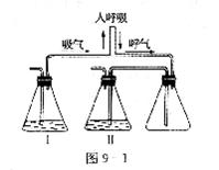 12.人吸入空气,排出CO2等气体。为了证明人呼出的气体中含有CO2且能有效排除空 气中CO2的干扰,某学生设计了如图9一1所示的实验装置,为了除去空气中的CO2和检验人呼出的气体中含有CO2,则锥形瓶Ⅰ、Ⅱ中加入的试剂为 ( )