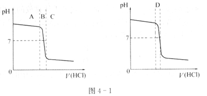 8.在滴有酚酞的氢氧化钠溶液中逐滴滴入盐酸,测定逐滴滴加盐酸后相应溶液的pH,并在坐标图中将这些点用光滑的曲线连接起来,得到溶液的pH随盐酸量增加而变化的图像。当加入一滴盐酸后,溶液颜色从红色突然变成无色,则滴入这滴盐酸前后溶液pH最可能的变化范围是(在图4-1中选择) ( )