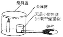 30.面粉加工厂的车间里若悬浮着较多的面粉粉尘,遇明火就有发生爆炸的危险。这是因为面粉粉尘与空气充分接触后,遇到明火急剧燃烧,在短时间内聚积大量的热,使气体的体积在有限的空间内迅速膨胀,从而引起爆炸。下面是模拟粉尘爆炸的一个实验:如下图所示,在无盖小塑料筒里加入干燥面粉,点燃蜡烛,用塑料盖盖住金属筒,迅速鼓入大量空气,不久,便会听到“砰”的一声,爆炸的气浪将塑料筒的塑料盖掀起。试问: