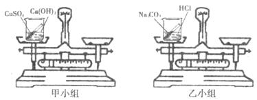 如图所示,甲小组把盛有适量CuSO4溶液的小试管放入盛有石灰水的烧杯中,乙小组把盛有适量Na2CO3溶液的小试管放入盛有稀盐酸的烧杯中;然后将烧杯放到天平上,添加砝码至平衡;接着取下烧杯并将其倾斜,使试管内和烧杯内的两种溶液混合发生反应,待反应后再把烧杯放到天平上,观察天平是否平衡。