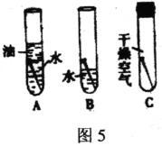 28.(6分)钢铁是人类生活和生产中非常重要的材料,但全世界每年都有约四分之一的钢铁因生锈而损失。某化学课外活动小组,对钢铁制品锈蚀的条件进行如下探究,设计了如图5所示的实验,据此回答下列有关问题: