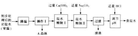 (二)岩盐水初步处理后,经净化、精制得到生产碳酸钠所需要的食盐水,同时制取副产品A晶体,其主要流程如下: