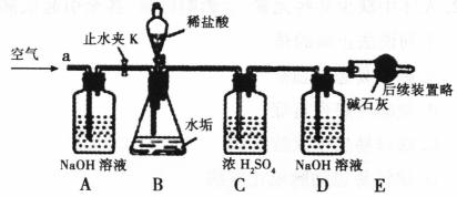 (1)加入样品前还应 ,装置B中盛放稀盐酸的仪器名称为 ,装置C的作用是 ,反应结束后打开止水夹K,缓缓鼓入空气的目的是 ,装置A的作用是 。A、B装置之间 设置干燥装置(填“要”、“不要”),其理由是 。