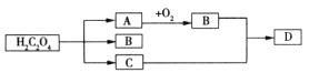 15.(8分)草酸(化学式:H2C2O4)在浓硫酸存在时加热分解为A、B、C三种初中常见的氧化物。其中C为最常见的液体溶剂,组成A、B两物质的元素相同,组成草酸与D的元素也相同。各物质之间的关系如下图所示(反应条件已省略):