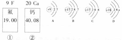 18.(16分)下图中①、②是氟元素、钙元素在元素周期表中的信息,A、B、C、D是四种粒子的结构示意图。