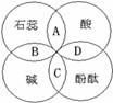 9.小红学习酸碱指示剂与常见酸、碱溶液作用后,归纳总结出如下图所示的关系。图中A、B、C、D是两圆相交的部分,分别表示指示剂与酸、碱溶液作用时所显示出的颜色,其中颜色不正确的是
