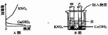 6、A图表示硝酸钾和氢氧化钙的溶解度随温度变化的情况。B图中甲、乙试管分别盛有硝酸钾、氢氧化钙的饱和溶液,试管底部均有未溶解的固体。向烧杯中加入氢氧化钠后,甲试管中固体 ,乙试管中的固体 ,(填增加或减少)。