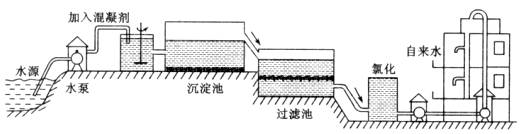 上图过滤池中有活性炭层,活性炭起 作用,该过程中发生 变化。氯化时,通常通入一定量氯气,它与水反应生成盐酸和次氯酸。实验室配制AgNO3溶液时不宜使用自来水,其原因是(用化学方程式表示) 。高铁酸钾(K2FeO4)是一种理想的水处理剂,高铁酸钾中铁元素的化合价是 。