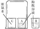 (3)如下图所示,将酚酞溶液分别倒入A、B两个小烧杯中,另取一个小烧杯C,加入约5 mL浓氨水。用一个大烧杯罩住A、C两个小烧杯。