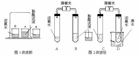 ③在B、C试管内分别倒入适量的沸水备用。另在A、D试管中分别倒入2mL浓氨水,立即用带橡皮塞的导管按图2连接好,并将D试管放置在沸水中,同时打开弹簧夹,观察现象。