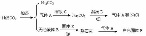 20.(10分)已知家庭常用的发酵粉主要成分为小苏打(NaHCO3)受热易分解为Na2CO3和两种氧化物A、B,且其中一种为植物光合作用所需要的气体,一种为生活中常见的无色液体。请根据下列图示关系回答下列问题: