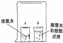 25.如下图所示,在烧杯A中装入10ml浓氨水。在烧杯B中装入20ml蒸馏水,滴入2-3滴酚酞试液,得到无色溶液。用一只大烧杯把A、B两烧杯罩在-起。几分钟后,可观察到烧杯B中溶液变_____________色。产生上述现象说明了什么?