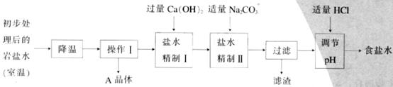 (二)岩盐水初步处理后,经净化、精制得到生产碳酸钠所需要的食盐水,同时制取副产品A晶体,其主要流程如下: