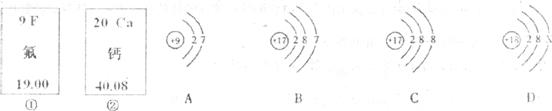 24.下图中的①、②是氟元素、钙元素在元素周期表中的信息,A、B、C、D是四种粒子的结构示意图。