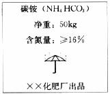 12.某品牌的碳酸氢铵(NH4HCO3俗名碳铵)化肥包装袋上印有下图标识,对该化肥的有关判断错误的是