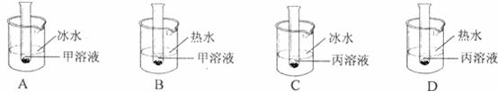 ③在室温时,将分别盛有甲、丙饱和溶液的试管各两支,分别放入盛有冰水或热水的烧杯中。根据甲、丙两物质的溶解度曲线,判断下图试管内所示现象正确的是 (填字母序号),该现象被叫做 。