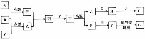 21.(8分)在下面关系图中,A、B、C、D是初中化学中常见的单质,甲、乙分别是酒精燃烧时一定会产生的两种物质,丁是常用建筑材料的主要成分,G为无色有刺激性气味的气体,能使紫色石蕊变蓝,J是赤铁矿的主要成分。
