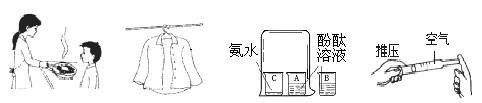 A.炒菜闻到香味 B.湿衣服晾干 C.酚酞遇氨水变红 D.压缩空气