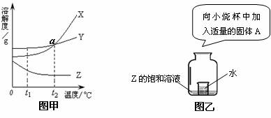 (1)图甲是X、Y、Z三种固体物质的溶解度曲线,其中a点表示的含义是________,其中物质Z的溶解度随温度升高而_____(填“增大”或“碱小”或“不变”)。