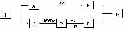 30.(5分) 下图所示为初中常见一些物质间的相互转化关系(有些条件已省略)。已知:常温下甲为液体,乙和E均为黑色固体,B是气体。请分析后作答: