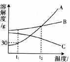 (3)将t2℃时A、B、C三种物质饱和溶液的温度降到t1℃时,三种溶液的溶质质量分数的大小关系是_________。