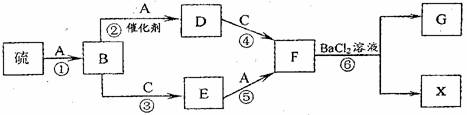 25.(4分)模拟酸雨形成的流程如下图所示。硫在单质气体A中燃烧发出蓝紫色火焰,生成刺激性气味的气体B;通常情况下C为无色液体,B、C、D是氧化物;E、F和X都是酸,G是白色沉淀。