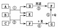 42.(6分)下图是初中化学中常见物质间的转化关系,其中,在通常情况下,F、G是组成元素相同的两种气体,Q、R都是黑色固体(部分反应条件略去),试回答下列问题: